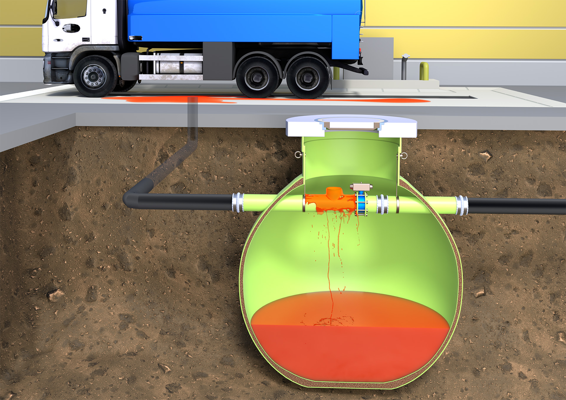 Während eines Umschlagvorganges wird das Durchlaufrohr über die Absperrklappe durch automatische Schaltung oder manuelle Betätigung verschlossen. Die dabei eventuell austretende wassergefährdende Flüssigkeit gelangt über den Überlauf in den Tank und wird so zurückgehalten. Durch eine Aufstausonde kann der Flüssigkeitsstand im Behälter erfasst und gemeldet werden.